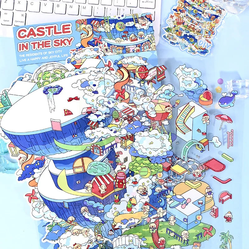 Sticker 3D Ville dans le ciel et gâteau d'anniversaire : 2 scènes miniatures